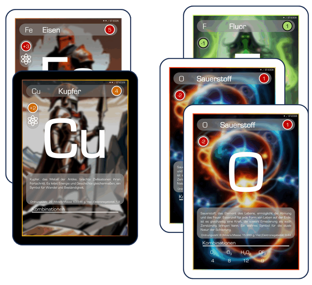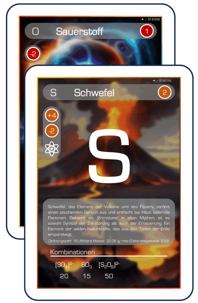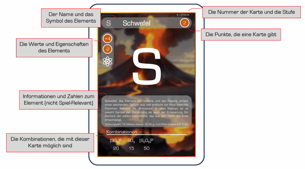 Da der Schwefel (S) die Ladung +4 und der Sauerstoff (O) -2 besitzt, wäre lediglich eine Verbindung aus einem Schwefel und 2 Sauerstoffen möglich. Die Kombination SO3 ermöglicht dem Spieler die Verwendung eines dritten Sauerstoffes. Der Spieler erhält dann anstelle von 5 Punkten (Summe der Punkte der verwendeten Karten) 15 Punkte, so wie es bei der Kombination steht.