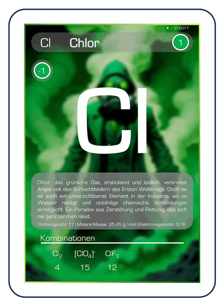 Für die Kombination wird wie gewohnt ein (1) Chlor und vier (4) Sauerstoffe benötigt, aber die Ladung dieser Kombination beträgt -1. Um sie also vollständig auszugleichen, wird mindestens eine weitere Karte mit einer Ladung von +1 benötigt.